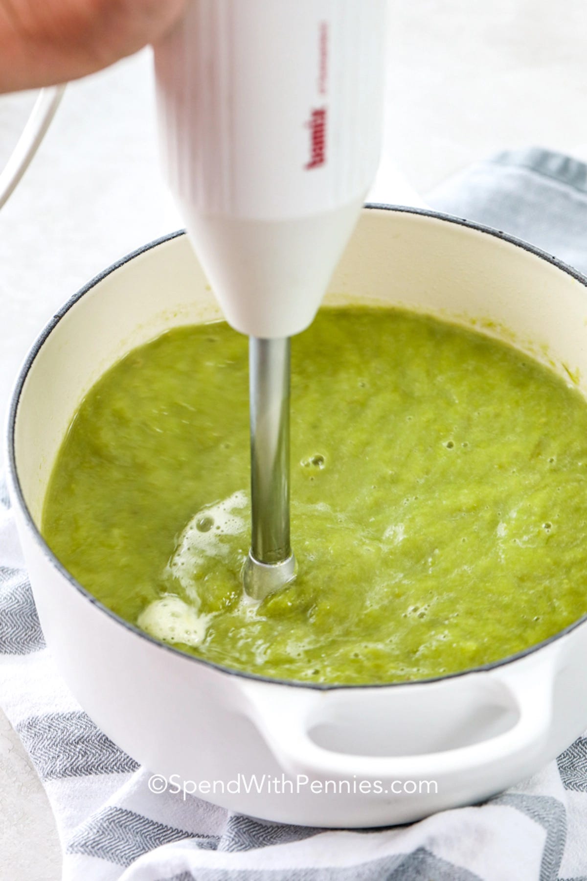 Puree the mixture with a blender or mixer until all bacon and asparagus are gone